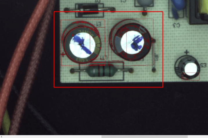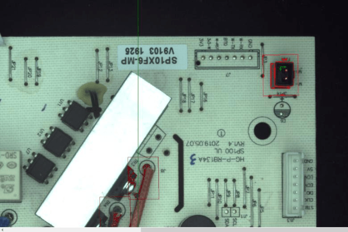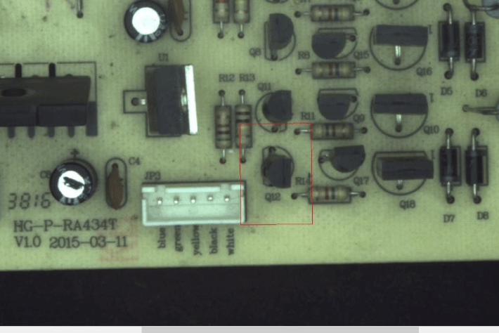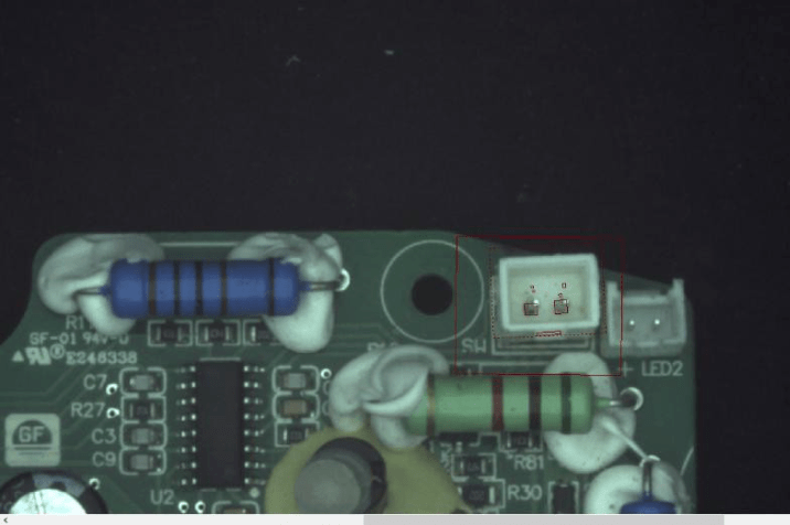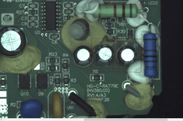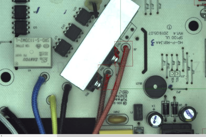 檢測流程如下:產品就位後客戶設備端給出觸發信號,工業相機完成圖像采(cǎi)集,PCB板元器件智能(néng)視覺檢測係統對(duì)檢測內容(元器件(插件)混料檢測、元器件(插件)有無檢測、元器件(插(chā)件(jiàn))正負極檢測、元器件(插件)顏色(sè)檢測、元器件(插件)方向檢測、焊線顏色檢(jiǎn)測、端子座(zuò)顏色檢測、端(duān)子座方向檢測)進行高效(xiào)分析處理。並將處理後的結(jié)果,輸出OK/NG結果給(gěi)到客戶指定端,整體檢測結果示意圖(tú)如下;